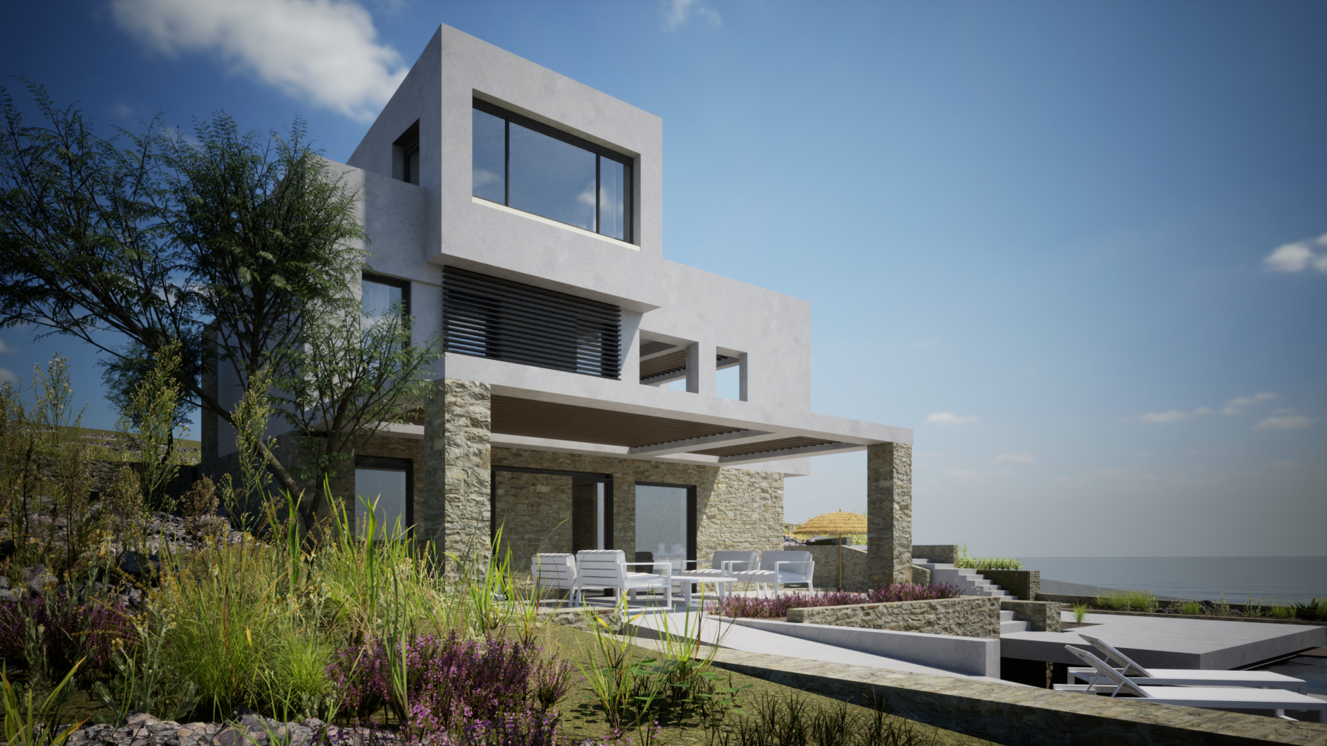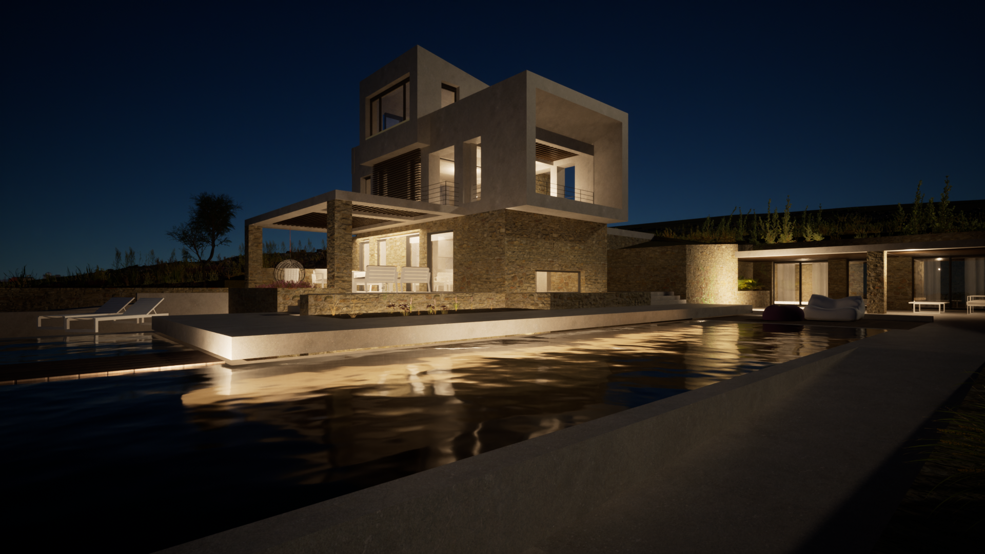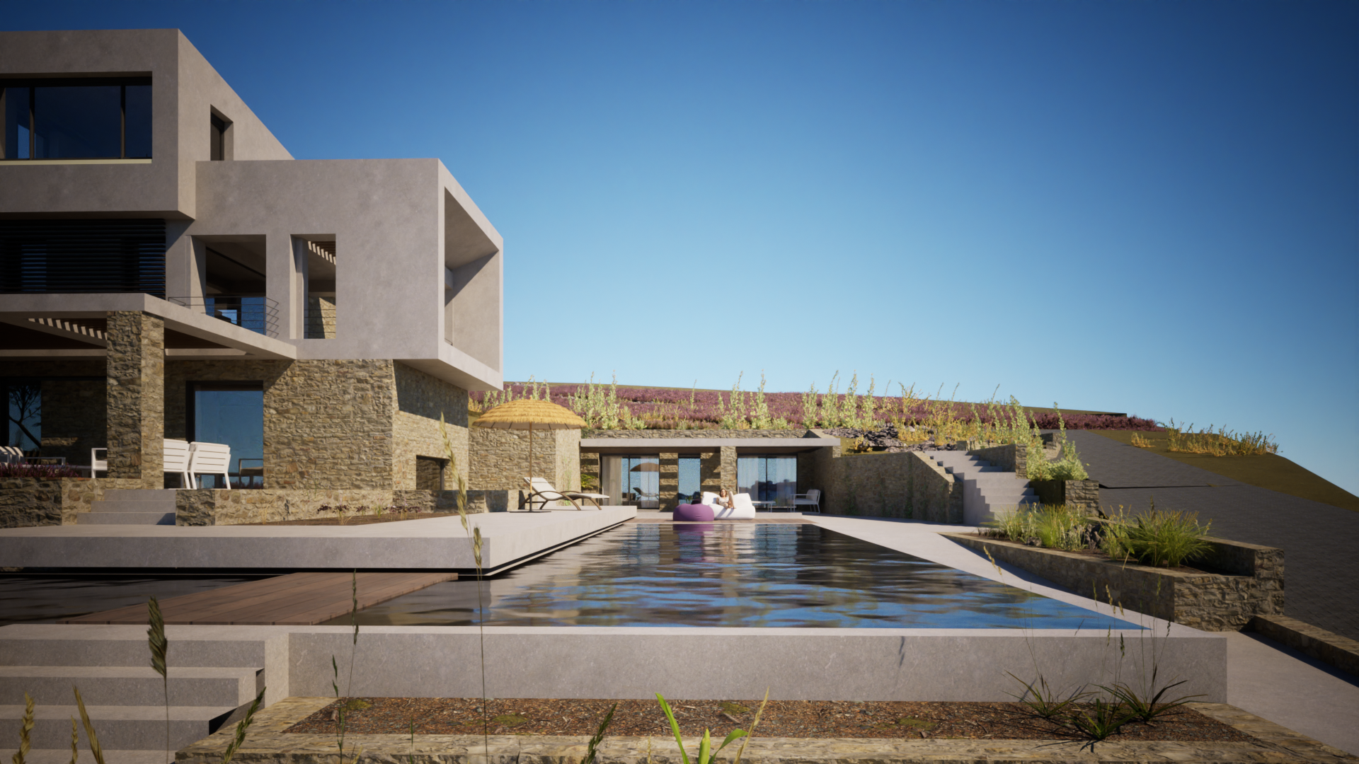 On a sloping plot in Kokkino Chorio, Chania, the residential complex was designed in harmony with the natural terrain, engaging in a dialogue with the view and the landscape. An above-ground and a semi-subterranean volume are connected through an open-air space, with the pool serving as a central focal point. Stone and earthy tones complement the surroundings, enhancing the integration with the environment.