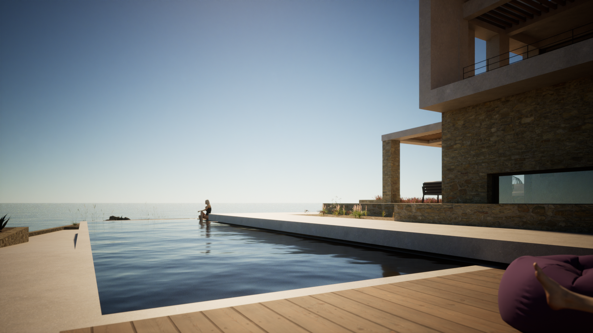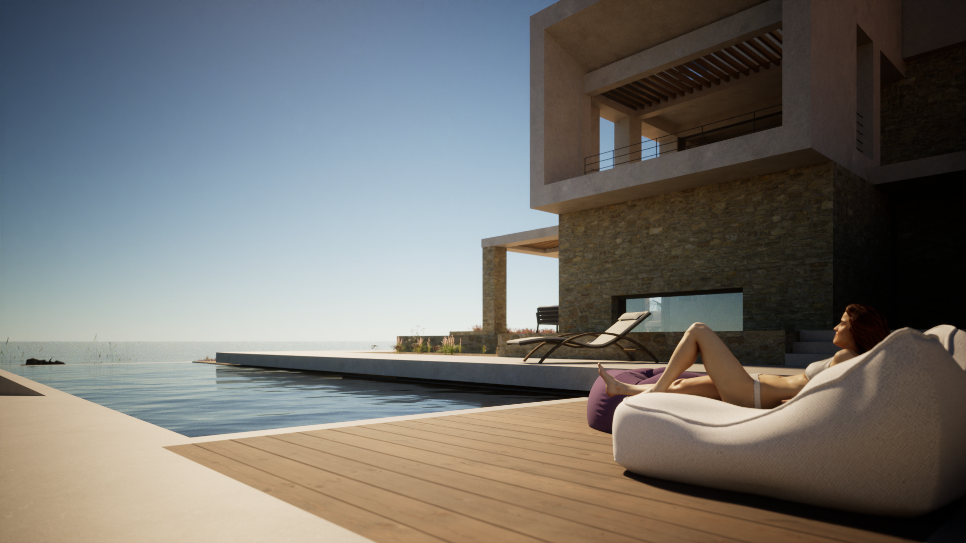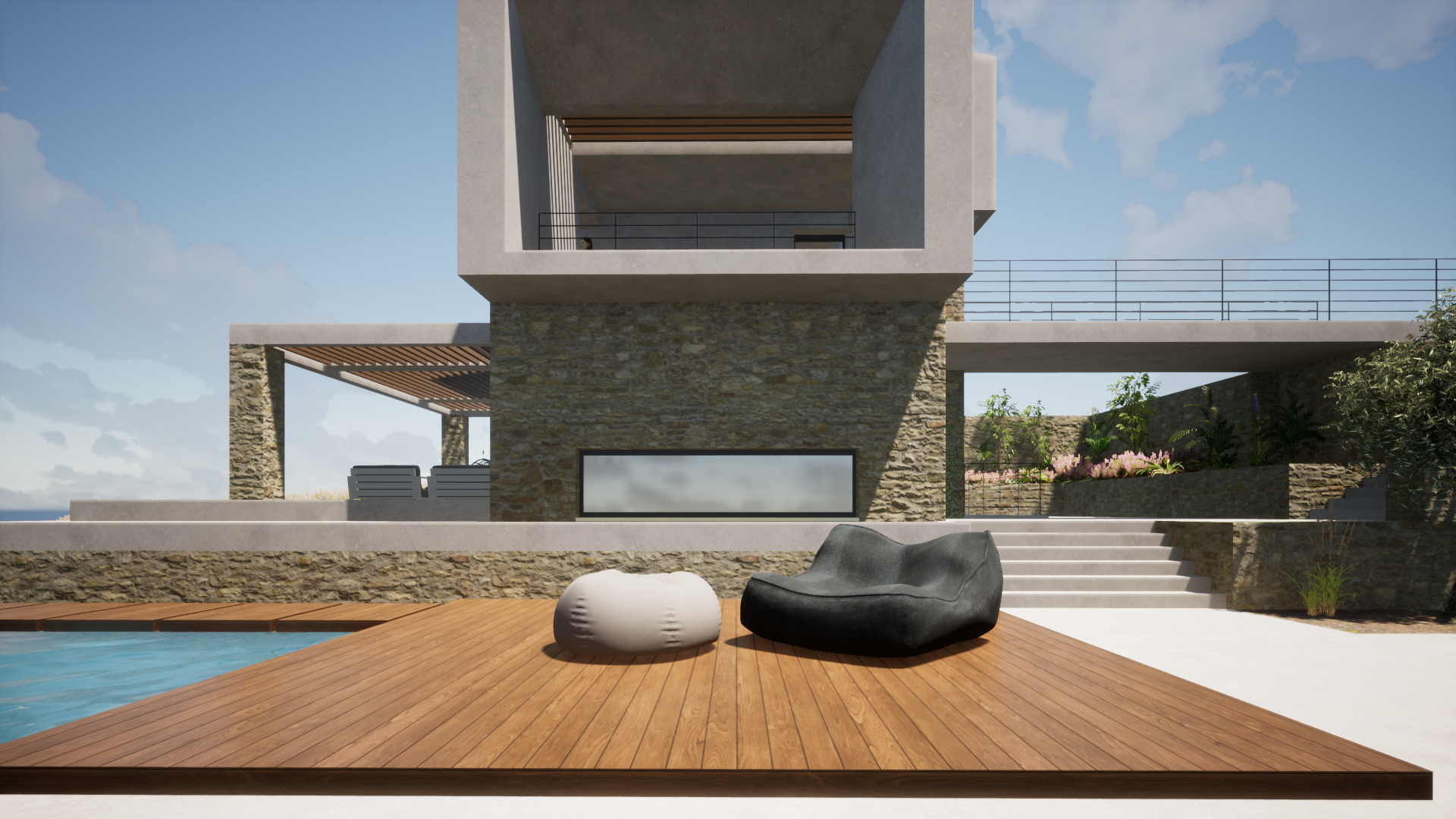 On a sloping plot in Kokkino Chorio, Chania, the residential complex was designed in harmony with the natural terrain, engaging in a dialogue with the view and the landscape. An above-ground and a semi-subterranean volume are connected through an open-air space, with the pool serving as a central focal point. Stone and earthy tones complement the surroundings, enhancing the integration with the environment.